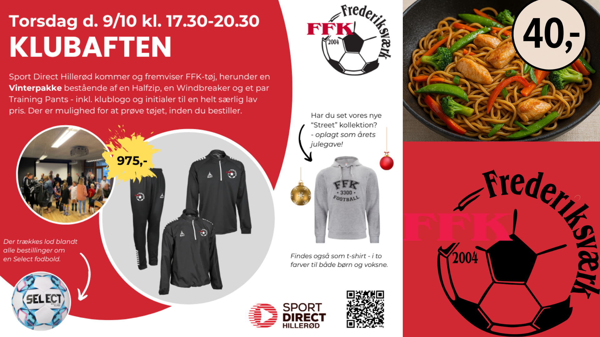 Derudover er der tøjaften, hvor vores samarbejdspartner Sport Direct kommer og fremviser FFK-tøj, herunder en vinterpakke, til en helt særlig lav pris.