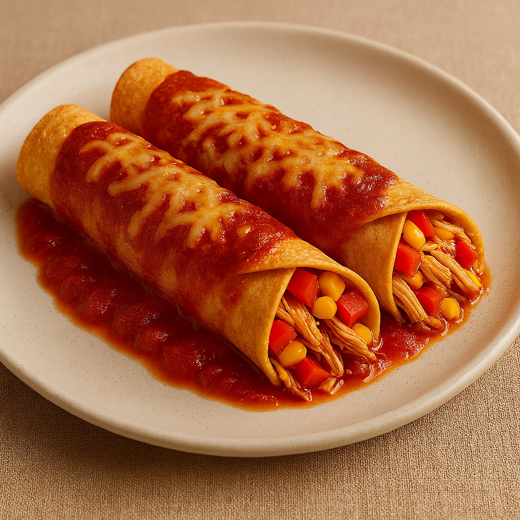 Enchilada med kylling, majs, løg, gulerod, hvidløg og ost på toppen
