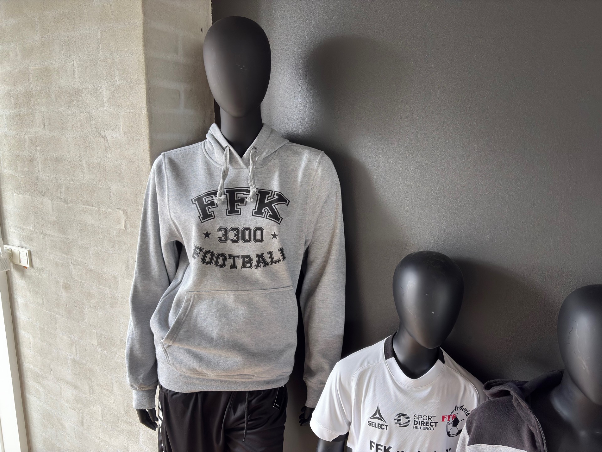 Du kan købe en hoodie i enten sort eller grå-melange med printet: "FFK - *3300* Football* over brystet. FFK har fået en af disse hjem, og den kan ses i klubhuset på første etage. Du kan også se den på billedet herunder.