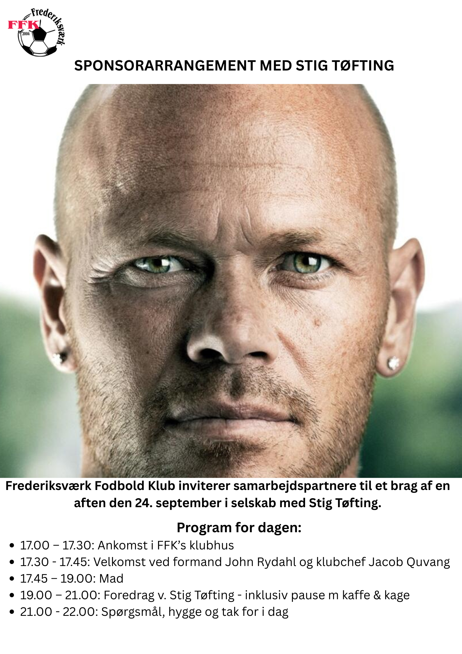 FFK er stolte af at invitere sponsorer og samarbejdspartnere til en helt unik oplevelse onsdag den 24. september. Her får vi besøg af Stig Tøfting – tidligere professionel fodboldspiller, landsholdsprofil og i dag en af Danmarks mest markante fodboldstemmer hos Viaplay.